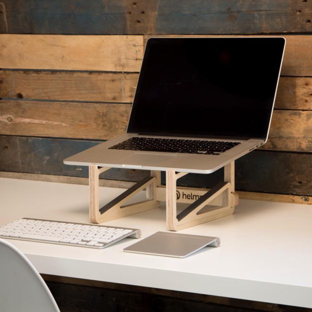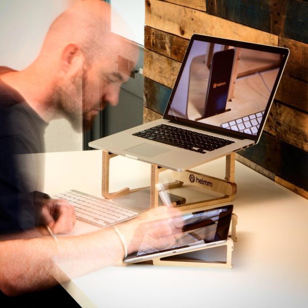 A close up of La-Stand. After CNC manufacturing, each component is hand sanded, silicon rubber strips are applied to protect your devices and the Helmm logo is hot branded into the cross brace – all by us, at our UK workshop. Register on our website in May for a discount code! Link in bio